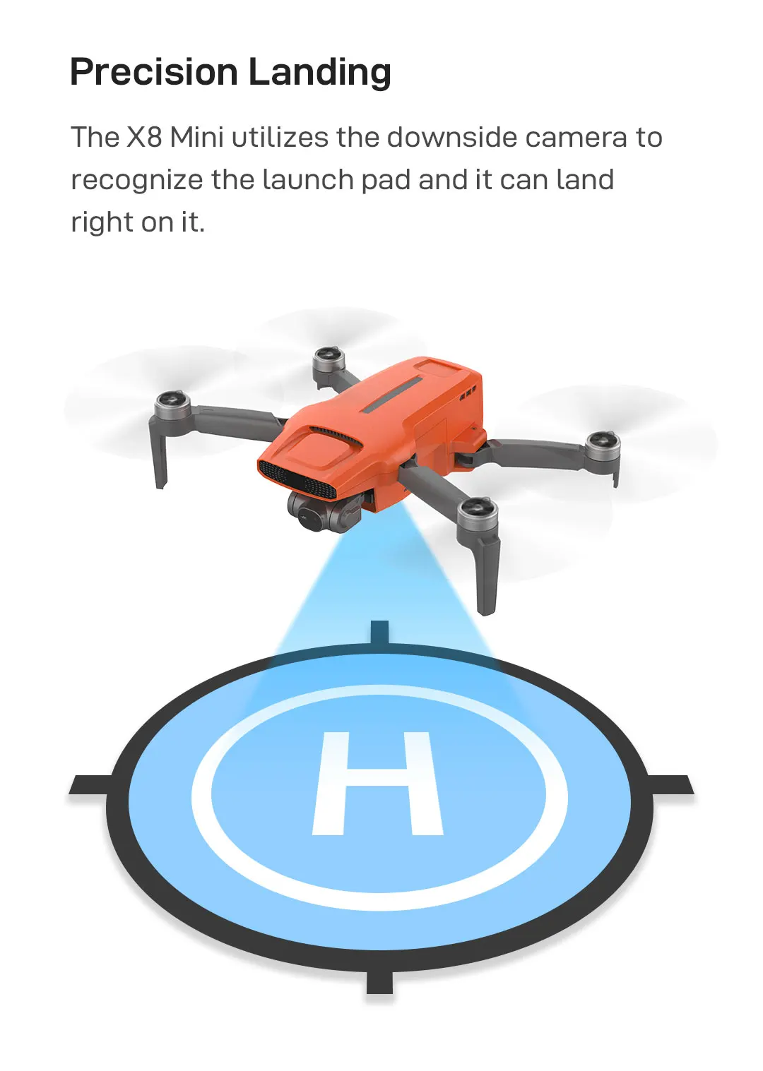 18. Pouso de precisão: O X8 Mini usa a câmera inferior para reconhecer a plataforma de lançamento e pode pousar diretamente sobre ela.